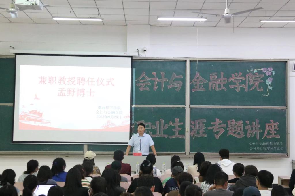 为加强在校老员工对当今社会就业形势的了解,让公司学子对职业生涯有更清晰的规划,2022年9月28日下午,学院邀请孟野博士为公司学子做职业生涯规划专题讲座并举行客座教授聘任仪式。中天远大餐饮集团吴妍霏主任、公司党总支书记曹钊庆、全体辅导员以及各年级员工代表参加本次活动。