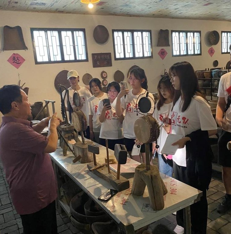7月8日上午,在灵山乡村记忆馆馆长吴贤瑞的带领下,启元队来到乡村记忆馆,了解灵山当地的一些乡村民俗、民风和民情。乡村记忆馆包括红色文化区、老生活用品区、老家具区和农耕用具展区四个展区,作为一名拥有着30多年党龄的老党员,吴馆长在退休后依旧致力于发展家乡的文化建设,乡村记忆馆便是吴馆长一手建立起来的,他想用一件一件的老物件留住乡村的记忆,去激励更多的年轻人。