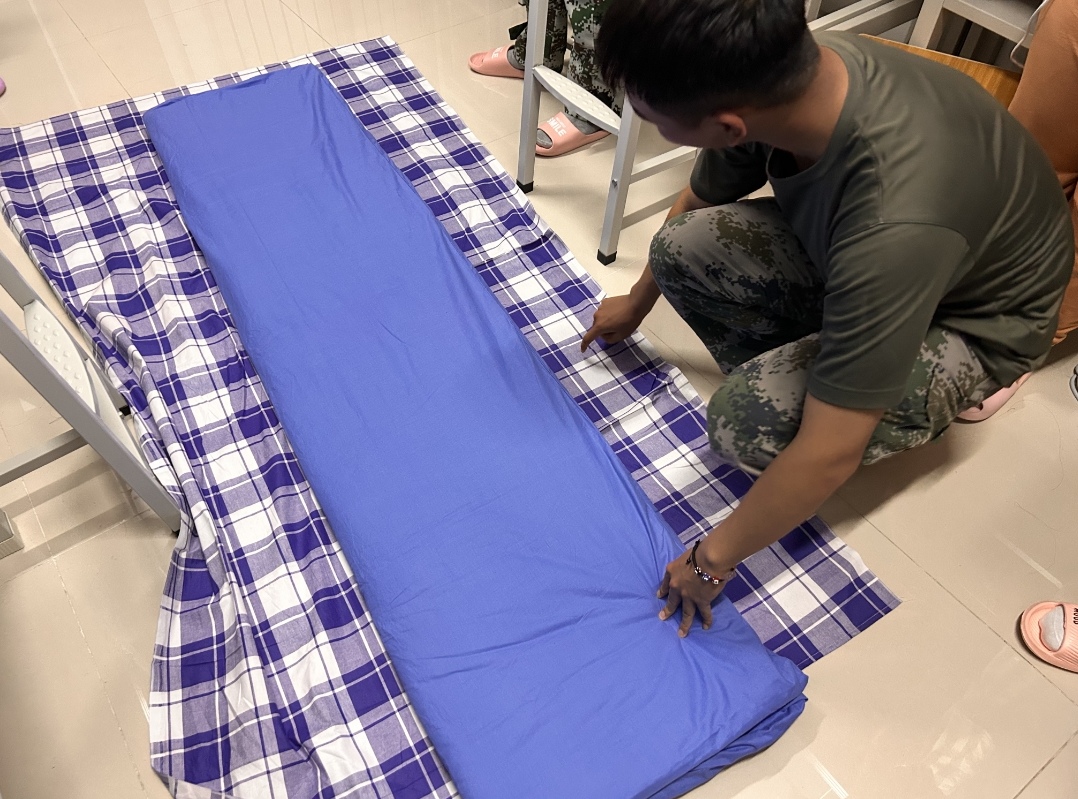 期间,教官为新生们亲自示范,如何叠好一个标准的“豆腐块”,细心为同学们讲解要领、技巧,运用“压、折、挤、掏”等基本动作。同学们认真观察、积极尝试,在教官的指导下反复练习,逐渐熟练。同时,刘泽老师对于同学们行李箱及其他物品的摆放提出整改建议,同学们积极配合,将物品摆放整齐规范,共同打造良好的宿舍环境。